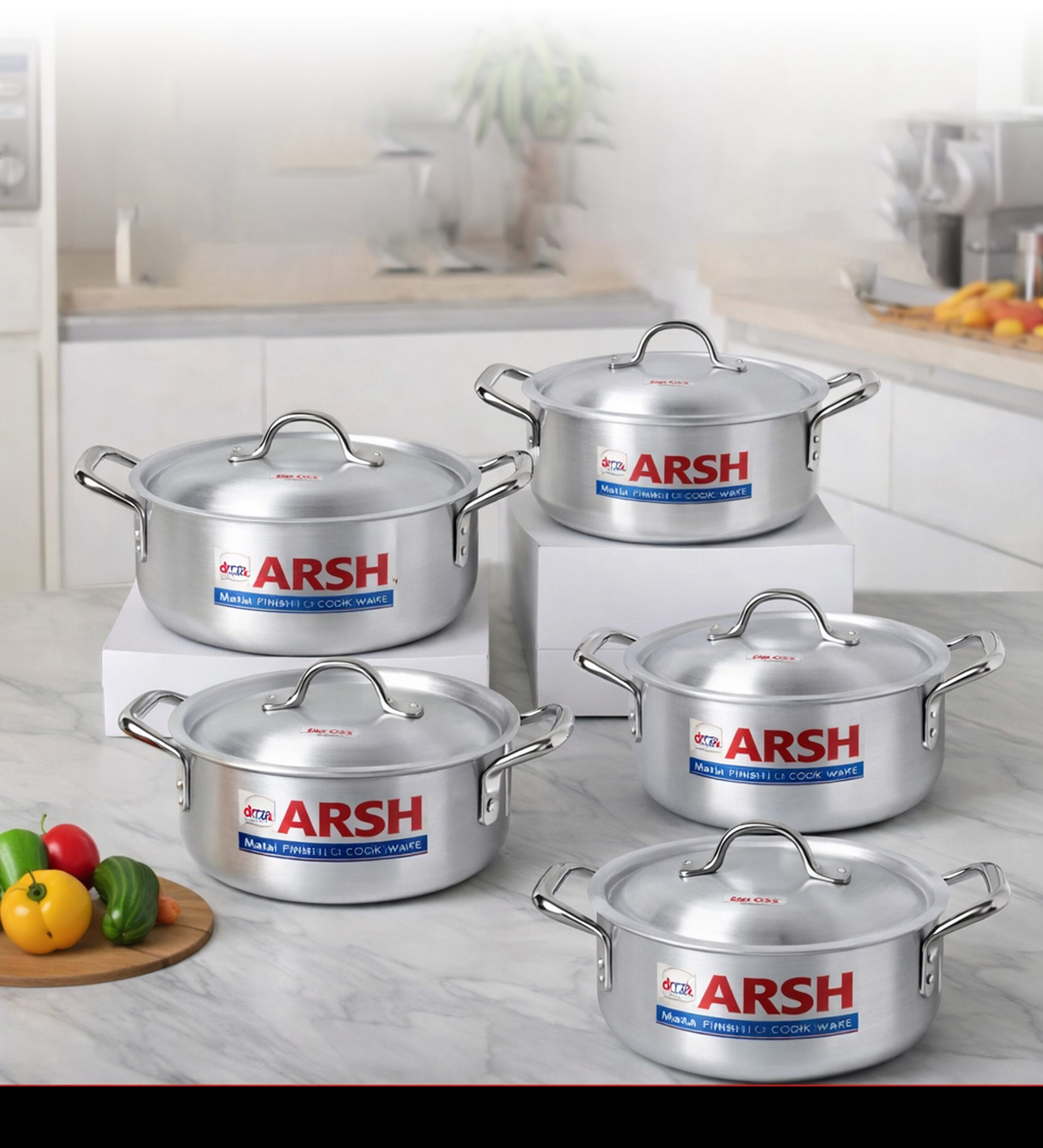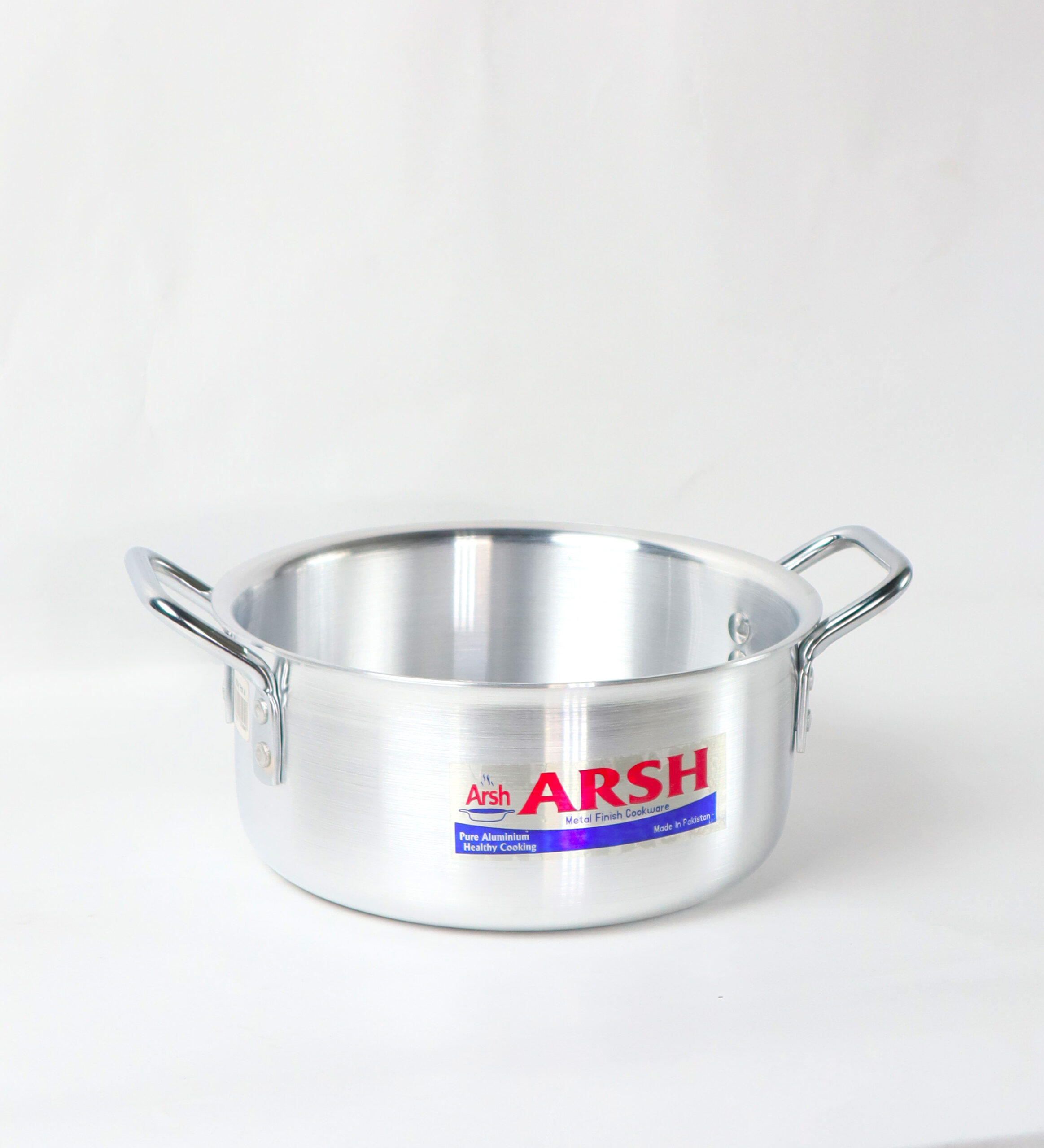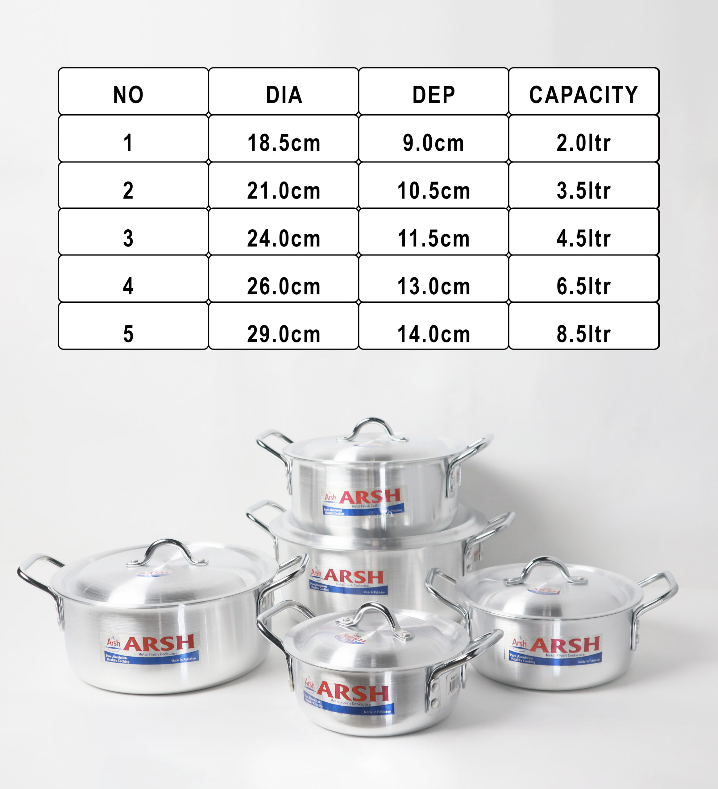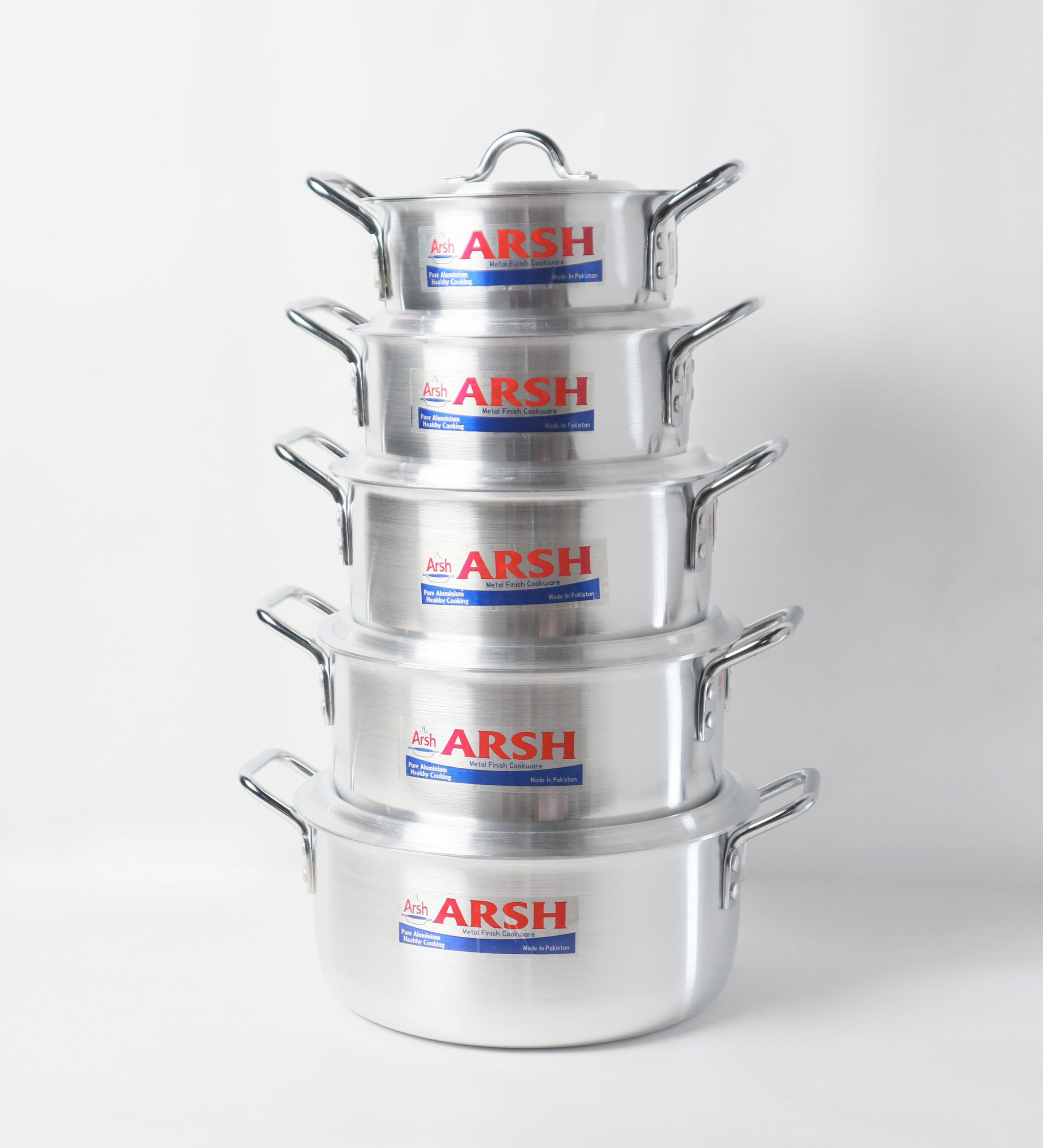 Each pot is designed with strong dual side handles made of metal, providing a firm and comfortable grip for safe handling during cooking. The lids include sturdy loop handles for easy lifting. The ARSH brand logo is prominently printed on the front of every pot, emphasizing authenticity and reliability.