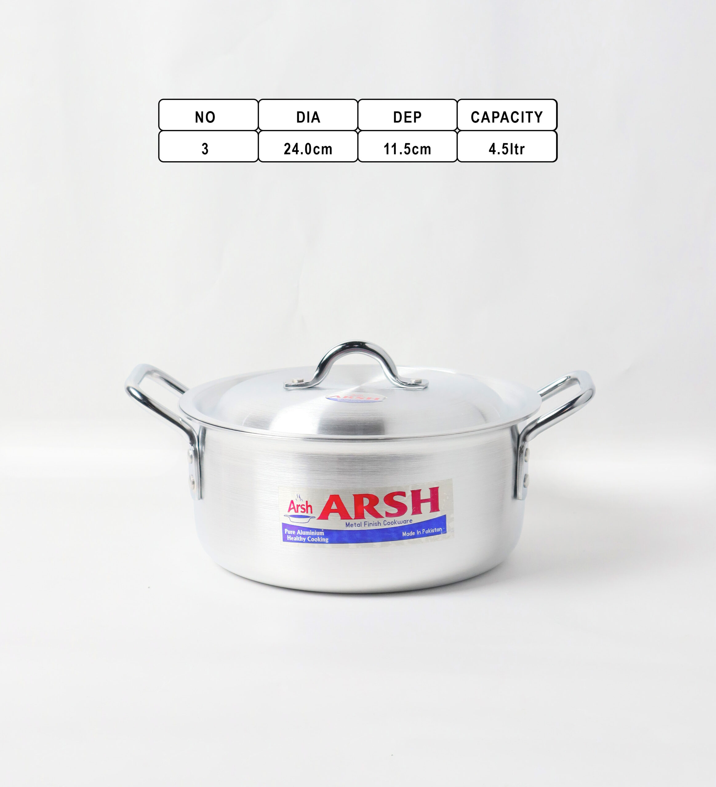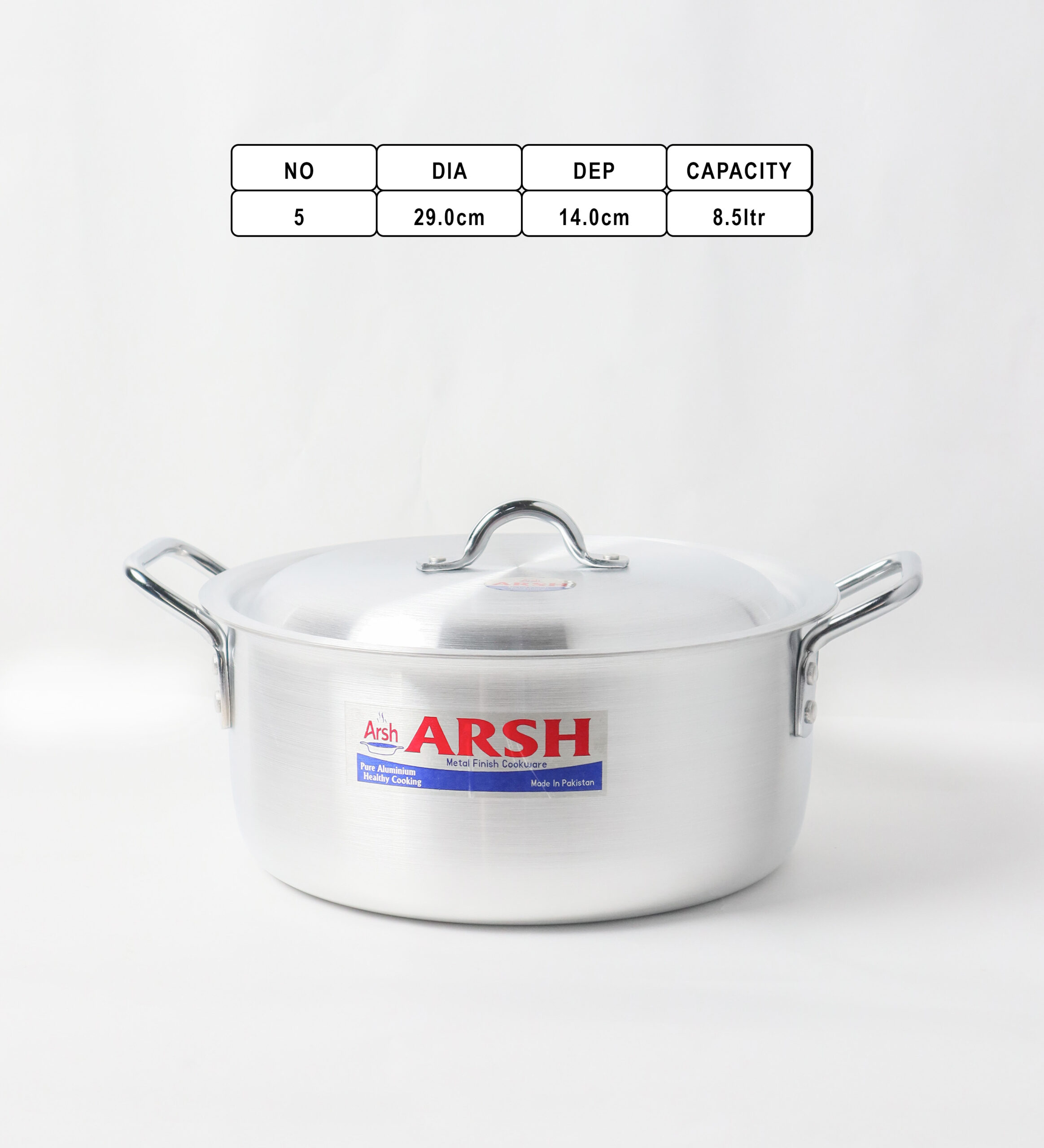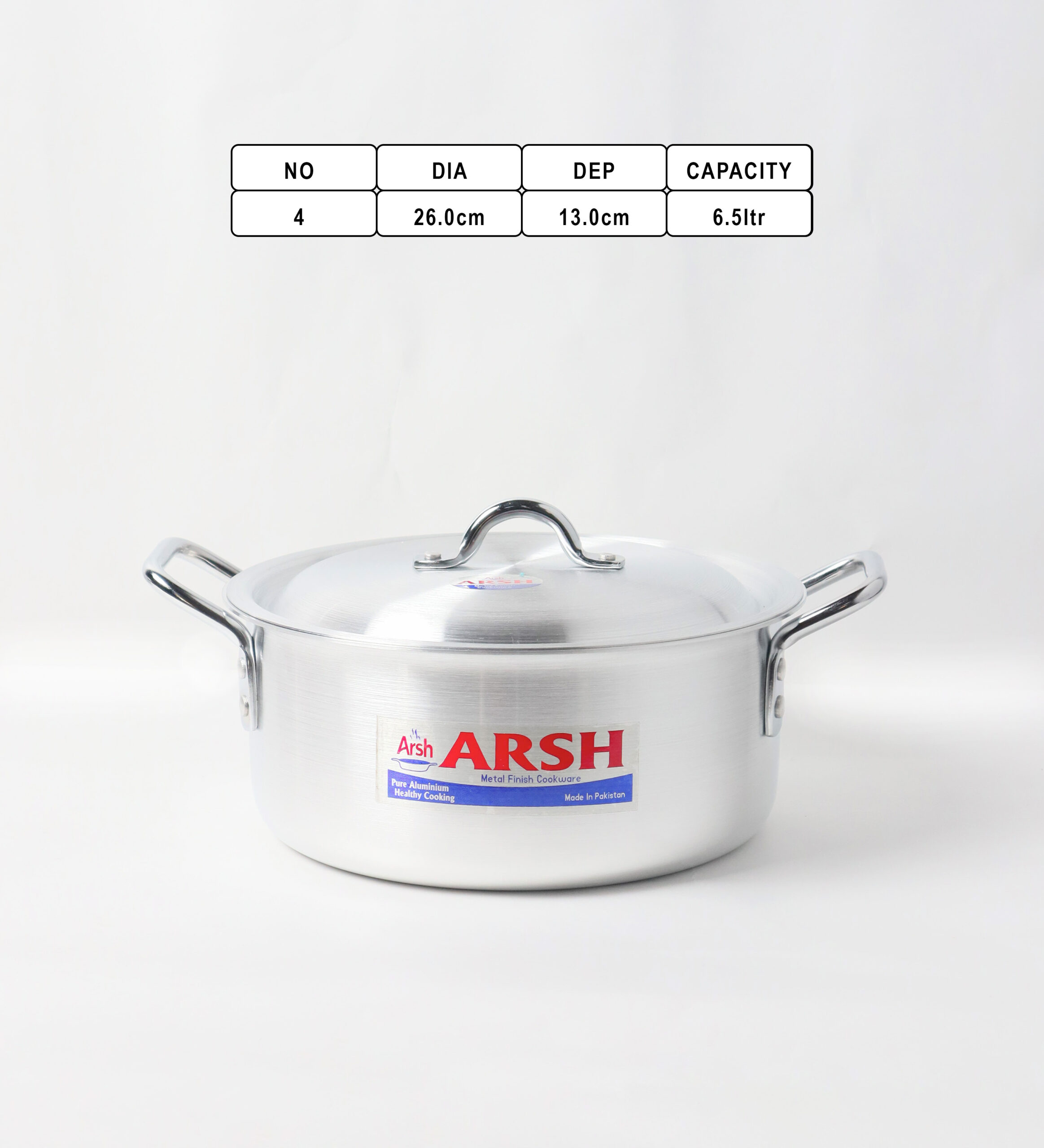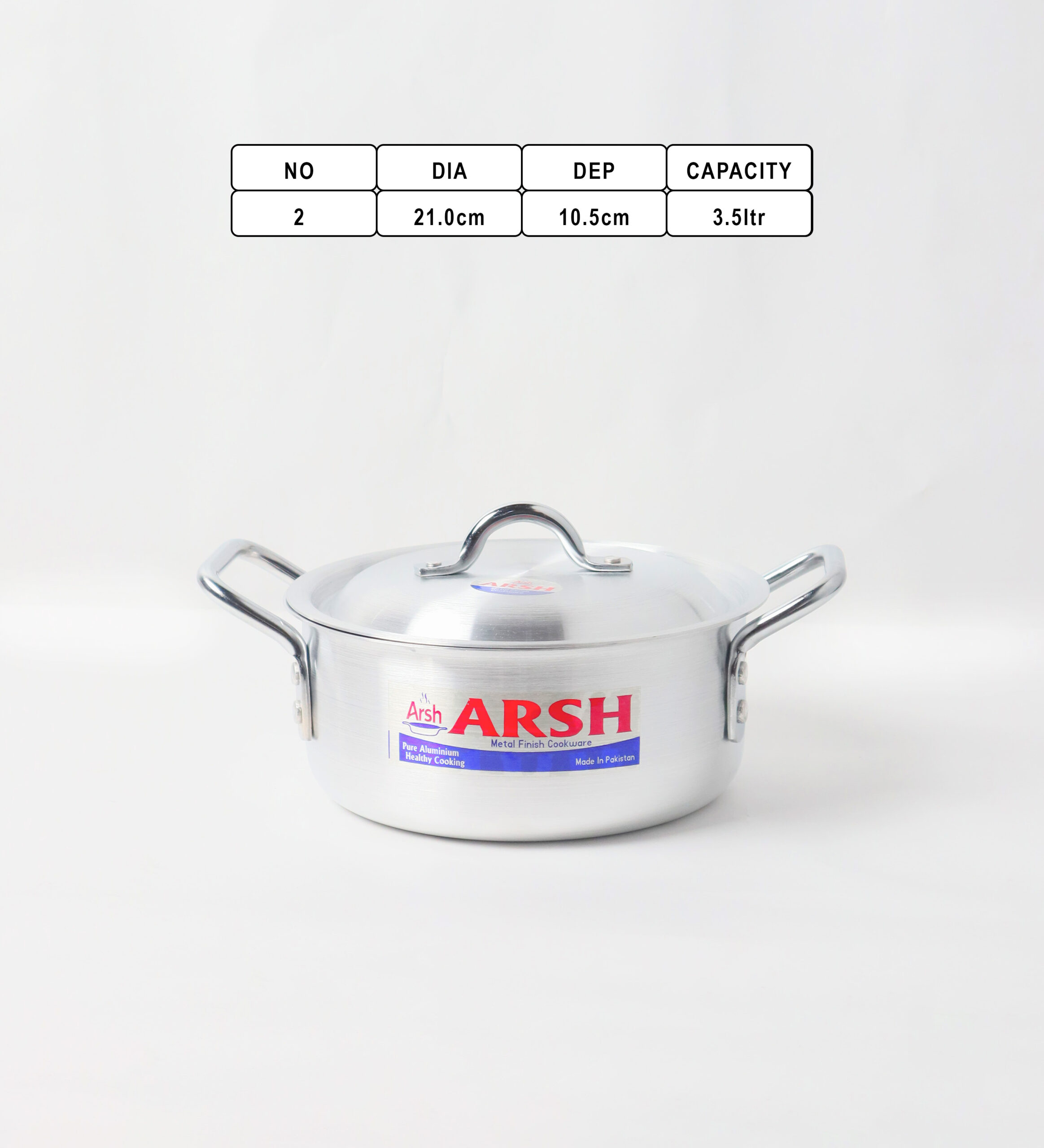 Each pot is designed with strong dual side handles made of metal, providing a firm and comfortable grip for safe handling during cooking. The lids include sturdy loop handles for easy lifting. The ARSH brand logo is prominently printed on the front of every pot, emphasizing authenticity and reliability.