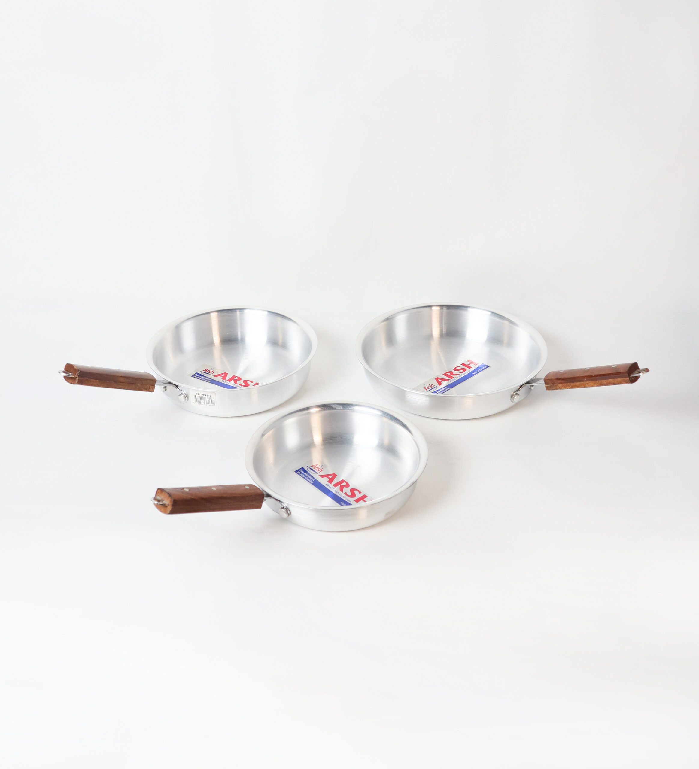 The frying pans are shown in three different sizes and are neatly arranged to highlight their variation in diameter. Inside each pan, the ARSH brand label is clearly visible, emphasizing authenticity and quality craftsmanship.